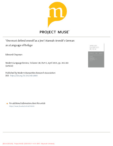 Chapman, Edmund (2025) 'One must defend oneself as a Jew': Hannah Arendt's German as a Language of Refuge. Modern Language Review, 120 (2). pp. 246-264. ISSN 0026-7937