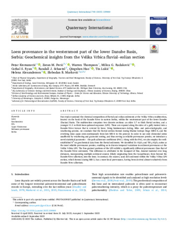 Krsmanović, Petar, Perić, Zoran M., Thompson, Warren, Radaković, Milica G., Ryan, Cathal S., Schaetzl, Randall J., Hao, Qingzhen, Lukić, Tin, Alexanderson, Helena and Marković, Slobodan B. (2025) Loess provenance in the westernmost part of the lower Danube Basin, Serbia: Geochemical insights from the Velika Vrbica fluvial–eolian section. Quaternary International, 748. p. 109969. ISSN 1040-6182