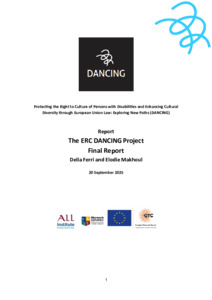 This report presents an overview of the past 5 years of research led under the European Research Council (ERC) funded project ‘Protecting the Right to Culture of Persons with Disabilities and Enhancing Cultural Diversity through European Union (EU) Law: Exploring New Paths – DANCING’. It describes the project, its objectives and ambitions, as well as delves into its organisational approaches and dissemination strategy. On the whole, the report showcases how DANCING has advanced the state of knowledge and contributed to methodological innovation. It further discusses the extent to which DANCING contributed to interdisciplinary scholarship on disability rights, particularly on the right of persons with disabilities to participate in cultural life, and supported the shaping of EU disability law as a standalone field of academic research. In that regard, the report shows that DANCING also enriched the broader scholarly debate on the EU integration, and on non-doctrinal methodological approaches to EU law. The impact of DANCING extends beyond scholarship, and the report further presents how the project endeavoured to effect social and policy change in the Cultural and Creative Sector (CCS).