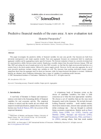 Panopoulou, Ekaterini (2007) Predictive financial models of the euro area: A new evaluation test. International Journal of Forecasting, 23 (4). pp. 695-705. ISSN 0169-2070