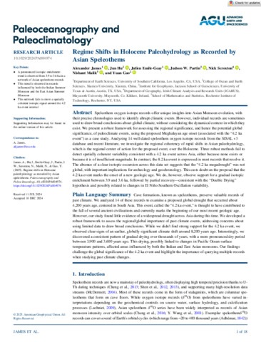 James, Alexander, Hu, Jun, Emile‐Geay, Julien, Partin, Judson W., Scroxton, Nick, Malik, Nishant and Gao, Yuan (2025) Regime Shifts in Holocene Paleohydrology as Recorded by Asian Speleothems. Paleoceanography and Paleoclimatology, 40 (1). ISSN 2572-4517