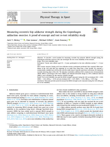 Hickey, Jack T., Lennon, Cian, Gillick, Michael and Sweeney, Liam (2025) Measuring eccentric hip adductor strength during the Copenhagen adduction exercise: A proof-of-concept and test re-test reliability study. Physical Therapy in Sport, 73. pp. 34-38. ISSN 1466-853X