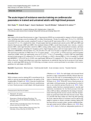 Banks, Nile, Rogers, Emily M., Stanhewicz, Anna E., Whitaker, Kara M. and Jenkins, Nathaniel D. M. (2025) The acute impact of resistance exercise training on cardiovascular parameters in trained and untrained adults with high blood pressure. European Journal of Applied Physiology, 125. pp. 2209-2224. ISSN 1439-6319
