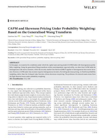 Sun, Jianchun, Wang, Lunyi, Wang, Yanyi and Zhang, Shunming (2025) CAPM and Skewness Pricing Under Probability Weighting: Based on the Generalised Wang Transform. International Journal of Finance & Economics. ISSN 1076-9307