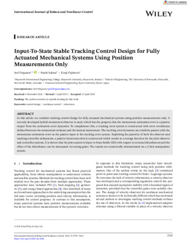 Ferguson, Joel, Sakata, Naoki and Fujimoto, Kenji (2025) Input‐To‐State Stable Tracking Control Design for Fully Actuated Mechanical Systems Using Position Measurements Only. International Journal of Robust and Nonlinear Control, 35 (14). pp. 5797-5810. ISSN 1049-8923
