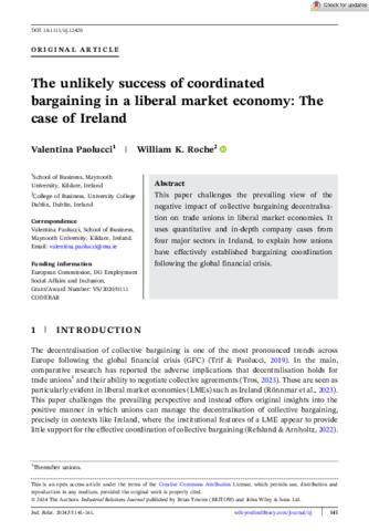 Paolucci, Valentina and Roche, William K. (2024) The unlikely success of coordinated bargaining in a liberal market economy: The case of Ireland. Industrial Relations Journal, 55 (2). pp. 141-161. ISSN 0019-8692