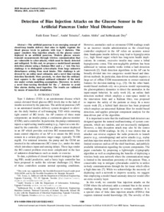 Emre Tosun, Fatih, Teixeira, Andre, Ahlen, Anders and Dey, Subhrakanti (2022) Detection of Bias Injection Attacks on the Glucose Sensor in the Artificial Pancreas Under Meal Disturbance. 2022 American Control Conference (ACC). pp. 1398-1405. ISSN 2378-5861