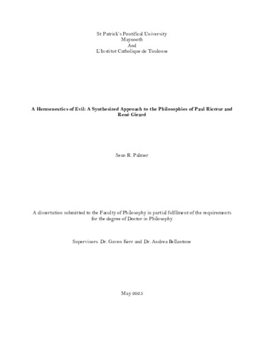Sean R., Palmer (2025) A Hermeneutics of Evil: A Synthesized Approach to the Philosophies of Paul Ricœur and René Girard. PhD thesis, St. Patrick’s Pontifical University Maynooth Ireland.