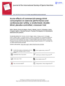 Banks, Nile, Rogers, Emily M., Helwig, Nate J., Schwager, Laura E., Alpers, Justin P., Schulte, Sydni L., Trachta, Emma R., Lockwood, Christopher M. and Jenkins, Nathaniel D.M. (2024) Acute effects of commercial energy drink consumption on exercise performance and cardiovascular safety: a randomized, double-blind, placebo-controlled, crossover trial. Journal of the International Society of Sports Nutrition, 21 (1): 2297988. pp. 1-28. ISSN 1550-2783