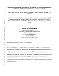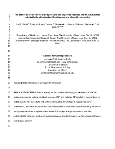 Banks, Nile, Rogers, Emily M., Stanhewicz, Anna E., Whitaker, Kara M. and Jenkins, Nathaniel D. M. (2024) Resistance exercise lowers blood pressure and improves vascular endothelial function in individuals with elevated blood pressure or stage-1 hypertension. American Journal of Physiology-Heart and Circulatory Physiology, 326 (1). pp. 1-41. ISSN 0363-6135