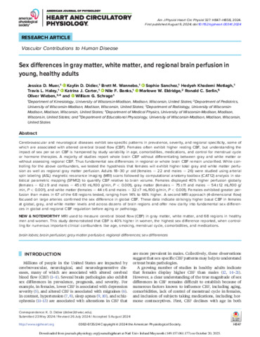 Muer, Jessica D., Didier, Kaylin D., Wannebo, Brett M., Sanchez, Sophie, Khademi Motlagh, Hedyeh, Haley, Travis L., Carter, Katrina J., Banks, Nile, Eldridge, Marlowe W., Serlin, Ronald C., Wieben, Oliver and Schrage, William G. (2024) Sex differences in gray matter, white matter, and regional brain perfusion in young, healthy adults. American Journal of Physiology-Heart and Circulatory Physiology, 327. H847-H858. ISSN 0363-6135