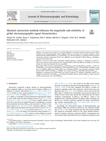 Tomko, Patrick M., Colquhoun, Ryan J., Banks, Nile, Magrini, Mitchel A., Muddle, Tyler W.D. and Jenkins, Nathaniel D.M. (2019) Maximal contraction methods influence the magnitude and reliability of global electromyographic signal characteristics. Journal of Electromyography and Kinesiology, 48. pp. 121-127. ISSN 1050-6411