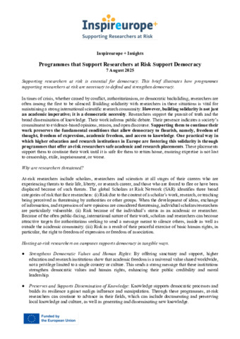 Inspireurope+, Insights (2025) Inspireurope + Insights: Programmes that Support Researchers at Risk Support Democracy. Project Report. Inspireurope+ Europe.