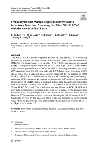Baldwin, E., De Lucia, M., Bracken, Colm, Ulbricht, G., Creaner, O., Piercy, J. and Ray, T. (2022) Frequency Domain Multiplexing for Microwave Kinetic Inductance Detectors: Comparing the Xilinx ZCU111 RFSoC with the New 2x2 RFSoC Board. Journal of Low Temperature Physics, 209 (3-4). pp. 640-648. ISSN 0022-2291