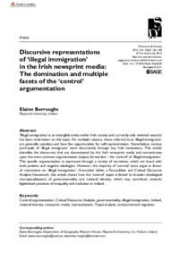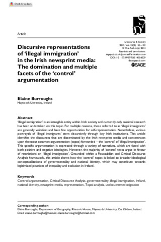 Burroughs, Elaine (2015) Discursive representations of ‘illegal immigration’ in the Irish newsprint media: The domination and multiple facets of the ‘control’ argumentation. Discourse & Society, 26 (2). pp. 165-183. ISSN 0957-9265
