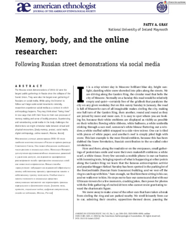 Gray, Patty A. (2016) Memory, body, and the online researcher: Following Russian street demonstrations via social media. American Ethnologist, 43 (3). pp. 500-510. ISSN 0094-0496