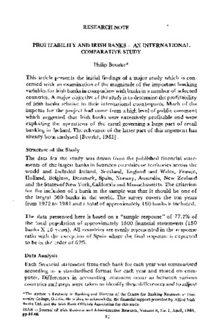 of Irish banks relative to their international counterparts. Much of the impetus for the project had come from a high level of public comment which suggested that Irish banks were excessively profitable and were exploiting the operations of the cartel governing a large part of retail banking in Ireland. The relevance of the latter part of this argument has already been analysed [Bourke, 1981].
