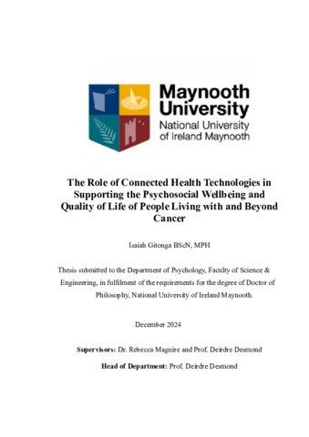 Gitonga, Isaiah (2024) The Role of Connected Health Technologies in Supporting the Psychosocial Wellbeing and Quality of Life of People Living with and Beyond Cancer. PhD thesis, National University of Ireland Maynooth.