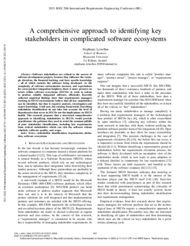 Lewellen, Stephanie (2021) A comprehensive approach to identifying key stakeholders in complicated software ecosystems. In: 2021 IEEE 29th International Requirements Engineering Conference (RE), 20-24 September 2021, Notre Dame, IN, USA.
