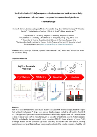 Beirne, Darren F., Arakelyan, Jemma, Forner, Matteo, Choe, Ho-Jung, Dempsey, Eithne, Gandin, Valentina, Velasco-Torrijos, Trinidad, Babak, Maria V and Montagner, Diego (2025) Sunitinib-derived Pt(IV) complexes display enhanced anticancer activity against renal cell carcinoma compared to conventional platinum chemotherapy. Journal of Medicinal Chemistry. ISSN 0022-2623