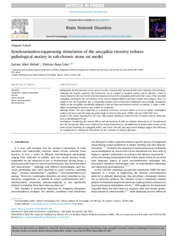 Réboli, Larissa Altoé and Cota, Vinícius Rosa (2025) Synchronization-suppressing stimulation of the amygdala circuitry reduces pathological anxiety in sub-chronic stress rat model. Brain Network Disorders, 1 (1). pp. 49-56. ISSN 30506239
