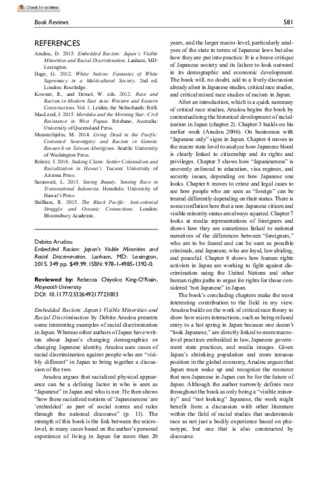 King-O’Riain, Rebecca Chiyoko (2017) Book Review: Embedded Racism: Japan’s Visible Minorities and Racial Discrimination. Sociology of Race and Ethnicity, 3 (4). pp. 581-582. ISSN 2332-6492