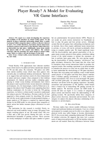 Bierig, Ralf and Namara, Damien Mac (2020) Player Ready? A Model for Evaluating VR Game Interfaces. In: 2020 Twelfth International Conference on Quality of Multimedia Experience (QoMEX), 26-28 May 2020, Athlone, Ireland.