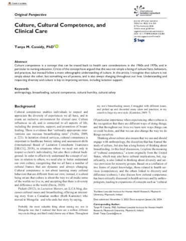 Cassidy, Tanya M. (2024) Culture, Cultural Competence, and Clinical Care. Journal of Human Lactation, 40 (2). pp. 216-220. ISSN 0890-3344