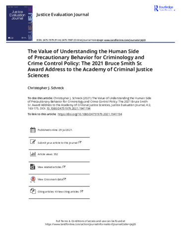 Schreck, Christopher (2021) The Value of Understanding the Human Side of Precautionary Behavior for Criminology and Crime Control Policy: The 2021 Bruce Smith Sr. Award Address to the Academy of Criminal Justice Sciences. Justice Evaluation Journal, 4 (2). pp. 163-175. ISSN 2475-1979