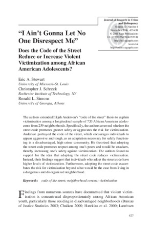 Schreck, Christopher (2006) "I ain't gonna let no one disrespect me": Does the code of the street reduce or increase violent victimization among African American Adolescents? Journal of Research in Crime and Delinquency, 43 (4). pp. 427-458. ISSN 1552-731X
