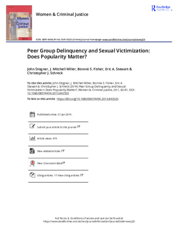 Stogner, John, Miller, J. Mitchell, Fisher, Bonnie S., Stewart, Eric A. and Schreck, Christopher (2014) Peer Group Delinquency and Sexual Victimization: Does Popularity Matter? Women & Criminal Justice, 24 (1). pp. 62-81. ISSN 0897-4454