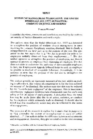 Meenan, Frances (1984) Restoring Management Prerogative: The Unfair Dismissals Act (1977) in Practice: Comment on Joye and Murphy. Irish Business and Administration Research, 6 (2): 9. pp. 113-117. ISSN 0332-1118