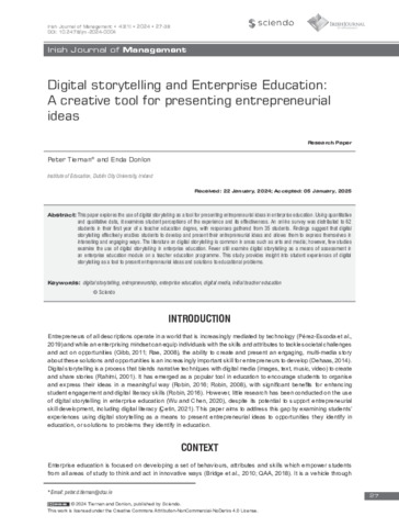 Tiernan, Peter and Donlon, Enda (2024) Digital storytelling and Enterprise Education: A creative tool for presenting entrepreneurial ideas. Irish Journal of Management, 43 (1): 3. pp. 27-38. ISSN 1649-248X