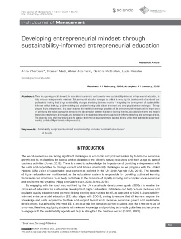 Zherdeva, Anna, Madi, Intesar, Alzankawi, Abrar, McQuillan, Deirdre and Morales, Lucia (2024) Developing entrepreneurial mindset through sustainability-informed entrepreneurial education. Irish Journal of Management, 43 (1): 5. pp. 59-70. ISSN 1649-248X