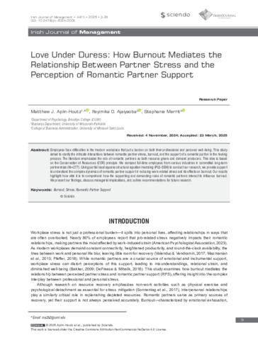 Aplin-Houtz, Matthew J., Ajaiyeoba, Ifeyimika O. and Merrit, Stephanie (2025) Love Under Duress: How Burnout Mediates the Relationship Between Partner Stress and the Perception of Romantic Partner Support. Irish Journal of Management, 44 (1): 2. pp. 3-26. ISSN 1649-248X
