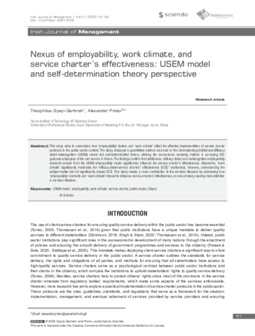 Gyepi-Garbrah, Theophilus and Preko, Alexander (2025) Nexus of employability, work climate, and service charter's effectiveness: USEM model and self-determination theory perspective. Irish Journal of Management, 44 (1): 4. pp. 51-66. ISSN 1649-248X