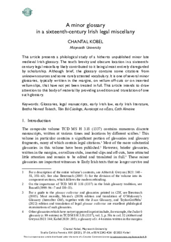 This article presents a philological study of a hitherto unpublished minor late medieval Irish glossary. The text’s brevity and obscure location in a sixteenth-century legal miscellany likely contributed to it being almost entirely disregarded by scholarship. Although brief, the glossary contains some citations from unknown sources and some rarely attested vocabulary. It is one of several minor glossaries, typically written in the margins, on vellum off-cuts or on inserted vellum slips, that have not yet been treated in full. This article intends to draw attention to this body of material by providing an edition and translation of one such glossary.