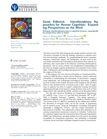 Salas, Jaime A. Riascos, Cota, Vinícius Rosa, Villota, Hernán and Vasquez, Daniel Betancur (2024) Guest Editorial. Interdisciplinary Approaches for Human Cognition: Expanding Perspectives on the Mind. International Journal of Psychological Research, 17 (2). pp. 1-2. ISSN 2011-7922