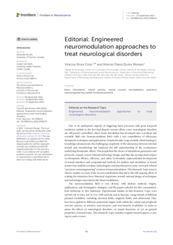 Cota, Vinícius Rosa (2022) Editorial: Engineered neuromodulation approaches to treat neurological disorders. Frontiers in Neuroscience, 16. pp. 1-3. ISSN 1662-453X