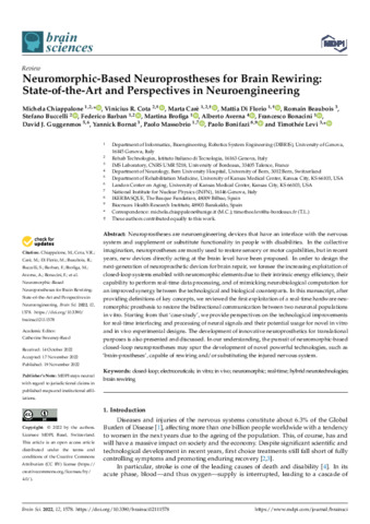 Chiappalone, Michela, Cota, Vinícius Rosa, Carè, Marta, Di Florio, Mattia, Beaubois, Romain, Buccelli, Stefano, Barban, Federico, Brofiga, Martina, Averna, Alberto, Bonacini, Francesco, Guggenmos, David J., Bornat, Yannick, Massobrio, Paolo, Bonifazi, Paolo and Levi, Timothée (2022) Neuromorphic-Based Neuroprostheses for Brain Rewiring: State-of-the-Art and Perspectives in Neuroengineering. Brain Sciences, 12 (1578). pp. 1-24. ISSN 2076-3425