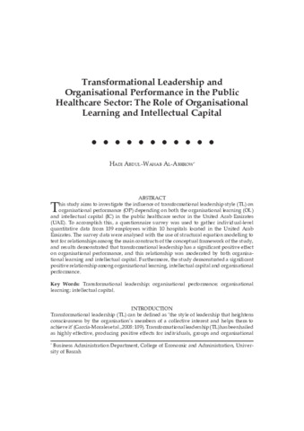 Al-Abrrow, Hadi Abdul-Wahab (2014) Transformational Leadership and Organisational Performance in the Public Healthcare Sector: The Role of Organisational Learning and Intellectual Capital. Irish Journal of Management, 33 (1): 4. pp. 27-48. ISSN 1649-248X