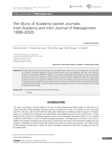 Kelliher, Felicity, Harrison, Richard, Gunnigle, Patrick, Monks, Kathy and Walsh, Jim (2025) The Story of Academy-owned Journals: Irish Academy and Irish Journal of Management 1996-2025. The Irish Journal of Management, 44 (2): 4. pp. 127-140. ISSN 1649-248X