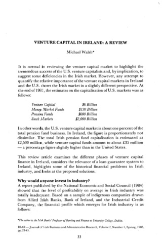Walsh, Michael (1985) Venture Capital in Ireland: A Review. Irish Business and Administration Research, 7 (1): 3. pp. 33-45. ISSN 0332-1118