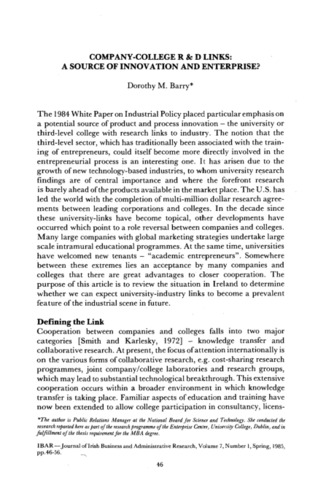 Barry, Dorothy M. (1985) Company-College R&D Links: A Source of Innovation and Enterprise. Irish Business and Administration Research, 7 (1): 4. pp. 46-56. ISSN 0332-1118