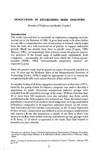 O'Sullivan, Brendan and Tomlin, Breffni (1985) Innovation in Established Irish Industry. Irish Business and Administration Research, 7 (1): 5. pp. 57-78. ISSN 0332-1118