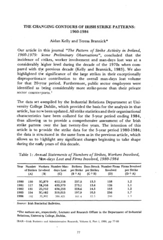 Kelly, Aidan and Brannick, Teresa (1986) The Changing Contours of Irish Strike Patterns: 1960-1984. Irish Business and Administration Research, 8 (1): 9. pp. 77-88. ISSN 0332-1118