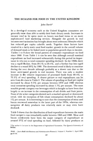 Davis, John (1983) The Demand for Food in the United Kingdom. Irish Business and Administration Research, 5 (1): 9. pp. 87-93. ISSN 0332-1118