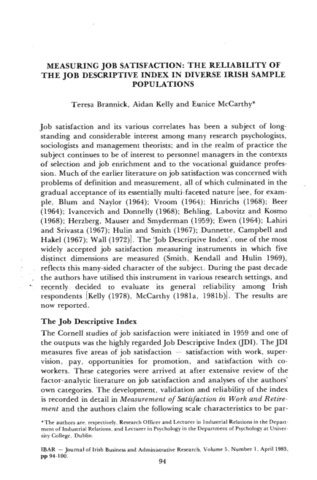 Brannick, Teresa, Kelly, Aidan and McCarthy, Eunice (1983) Measuring Job Satisfaction: The Reliability of the Job Descriptive Index in Diverse Irish Sample Populations. Irish Business and Administration Research, 5 (1): 10. pp. 94-100. ISSN 0332-1118
