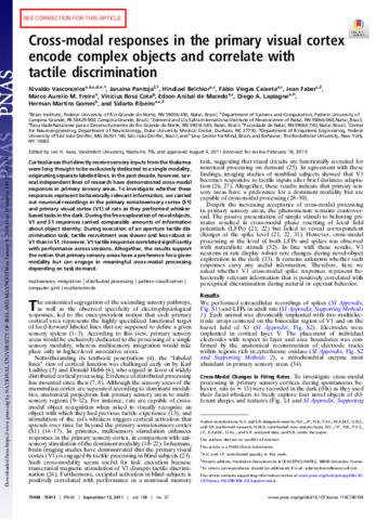 Vasconcelos, Nivaldo, Pantoja, Janaina, Belchior, Hindiael, Caixeta, Fábio Viegas, Faber, Jean, Freire, Marco Aurelio M., Cota, Vinícius Rosa, Anibal de Macedo, Edson, Laplagne, Diego A., Gomes, Herman Martins and Ribeiro, Sidarta (2011) Cross-modal responses in the primary visual cortex encode complex objects and correlate with tactile discrimination. Proceedings of the National Academy of Sciences, 108 (37). pp. 15408-15413. ISSN 1091-6490
