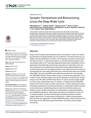 Blanco, Wilfredo, Pereira, Catia M., Cota, Vinícius Rosa, Souza, Annie C., Rennó-Costa, César, Santos, Sharlene, Dias, Gabriella, Guerreiro, Ana M. G., Tort, Adriano B. L., Neto, Adrião D. and Ribeiro, Sidarta (2015) Synaptic Homeostasis and Restructuring across the Sleep-Wake Cycle. PLoS Computational Biology, 11 (5): e1004241. pp. 1-29. ISSN 1553-734X